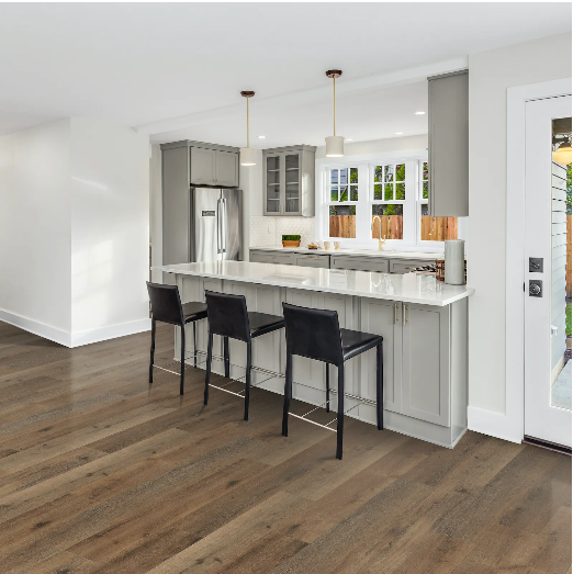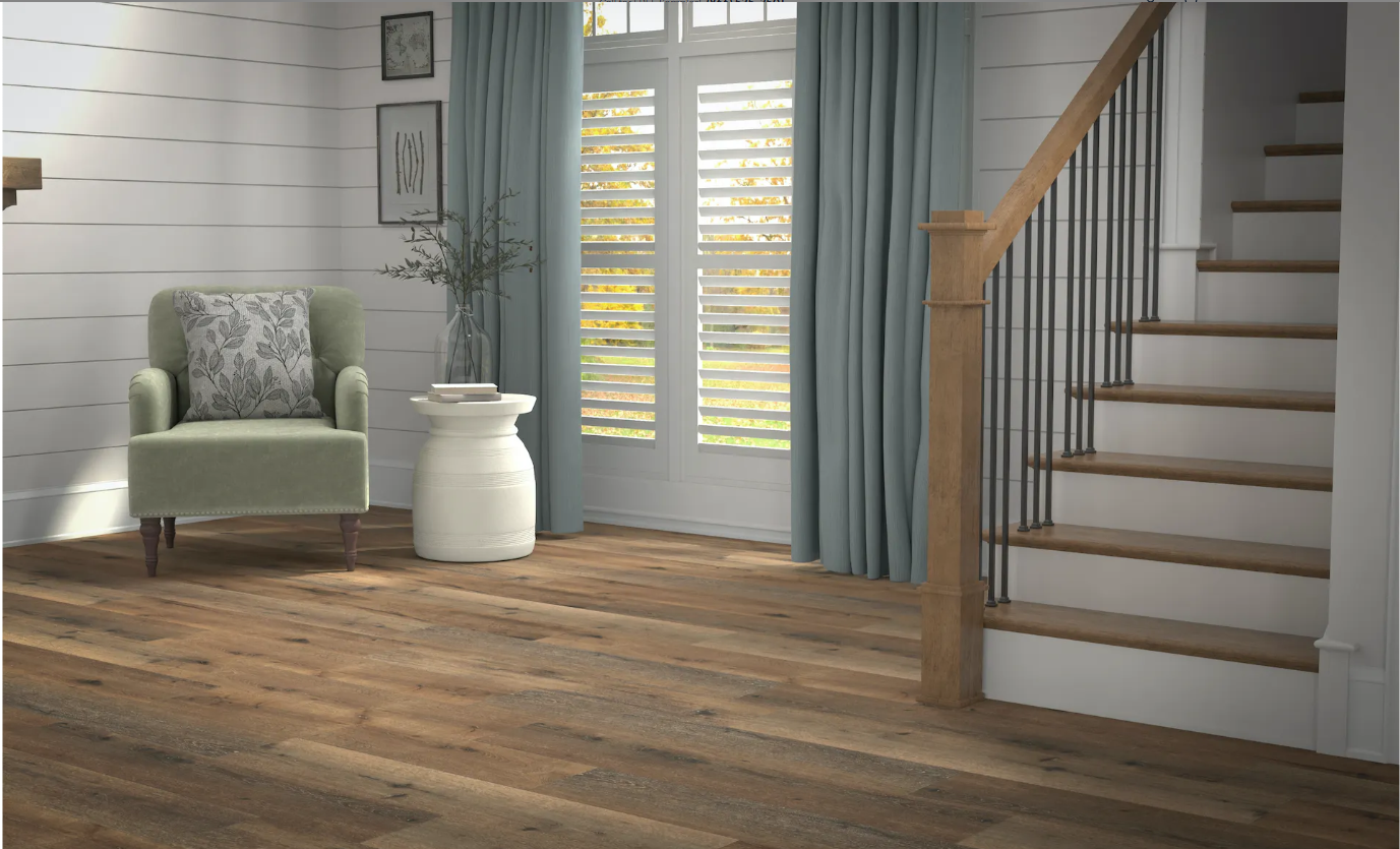 Vinyl plank flooring in the luxurious color of High Tide Elm offers a superb combination of style and durability, making it an excellent choice for your home. The extended length of each plank creates a sense of spaciousness while providing a resilient foundation for your living space. High Tide Elm’s rich brown hue adds a touch of warmth and elegance, making it an ideal choice to elevate the aesthetics of any room. The realistic wood-grain texture mirrors the natural beaty of elm wood, bringing timeless charm to your interior.